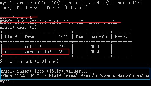 create table t16(id int,name varchar(16) not null); # 创建表t16;定义字段id,整型int类型,定义字段name,字符varchar类型,存储16个字符,不能为空