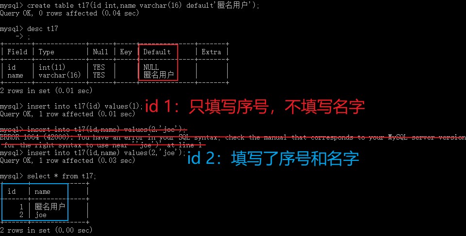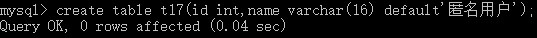 create table t17(id int,name varchar(16) default '匿名用户'); # 创建表t17;定义字段id,整型int类型;定义字段name,字符varchar类型,存储16个字符,默认填写匿名用户