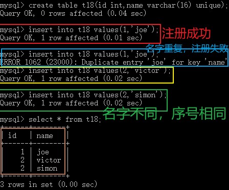 1,joe自然没问题,加了unique之后joe就不能重复添加了。