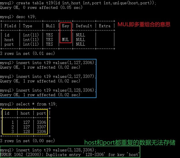 create table t19(id int,host int,port int,unique(host,port)); # 创建表t19,;定义字段id,整型int类型;定义字段host,整型int类型;定义字段port,整型int类型;host与port的组合不能重复