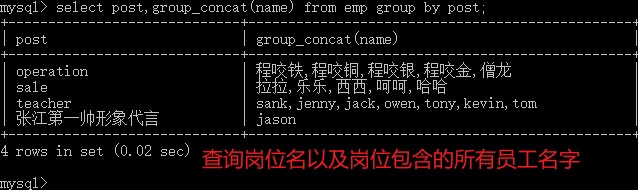 1.查询岗位名以及岗位包含的所有员工名字