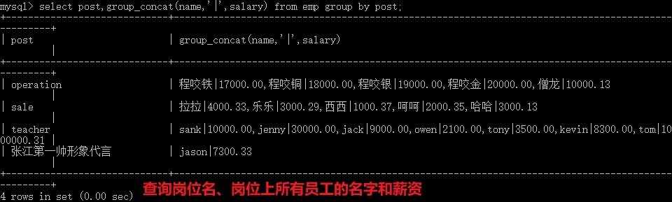 select post,group_concat(name,'|',salary) from emp group by post;
