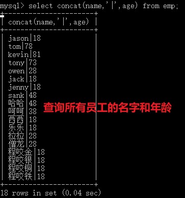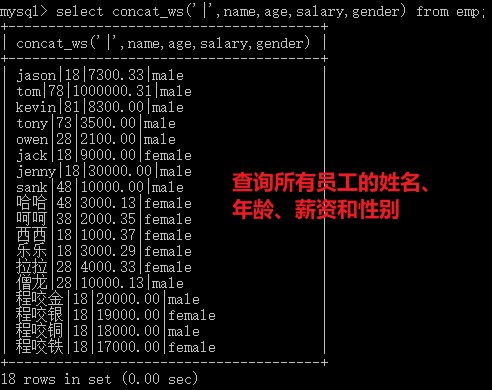 select id as'序号',name as '姓名' from emp; select concat_ws('|',name,age,salary,gender) as '综合数据' from emp;
