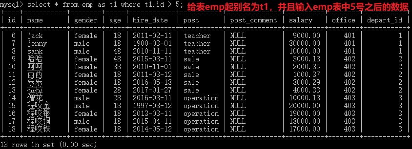 select * from emp as t1 where t1.id > 5; # 将emp表名起别名为t1,之后使用t1替代emp