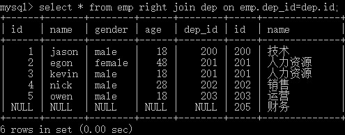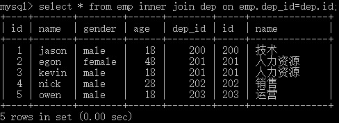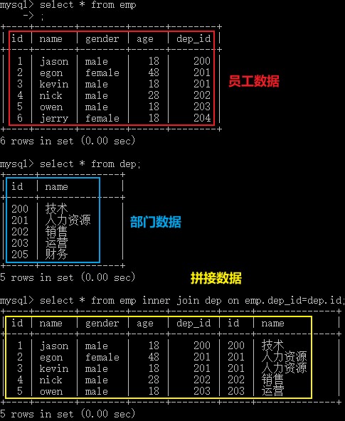 create database db1; user db1; #建表 create table dep( id int primary key auto_increment, name varchar(20) ); create table emp( id int primary key auto_increment, name varchar(20), gender enum('male','female') not null default 'male', age int, dep_id int ); #插入数据 insert into dep values (200,'技术'), (201,'人力资源'), (202,'销售'), (203,'运营'); insert into emp(name,gender,age,dep_id) values ('jason','male',18,200), ('egon','female',48,201), ('kevin','male',18,201), ('nick','male',28,202), ('owen','male',18,203), ('jerry','female',18,204);