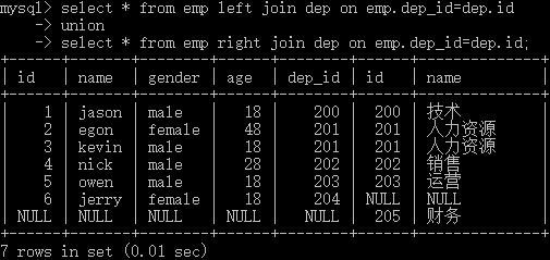 select * from emp left join dep on emp.dep_id=dep.id union select * from emp right join dep on emp.dep_id=dep.id;