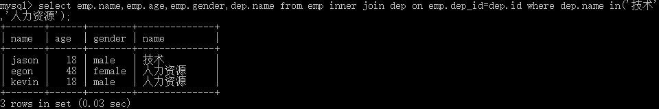 select emp.name,emp.age,emp.gender,dep.name from emp inner join dep on emp.dep_id=dep.id where dep.name in ('技术','人力资源');