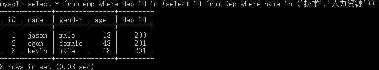 select * from emp where dep_id in (select id from dep where name in ('技术','人力资源'));