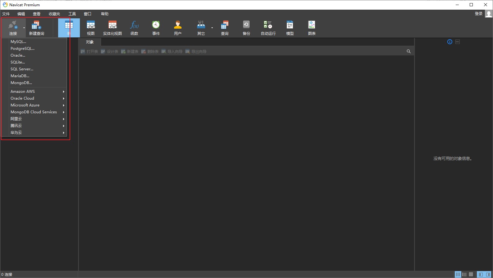进入Navicat程序后,首先看左上角。红框处的连接可以连接到多款数据库。