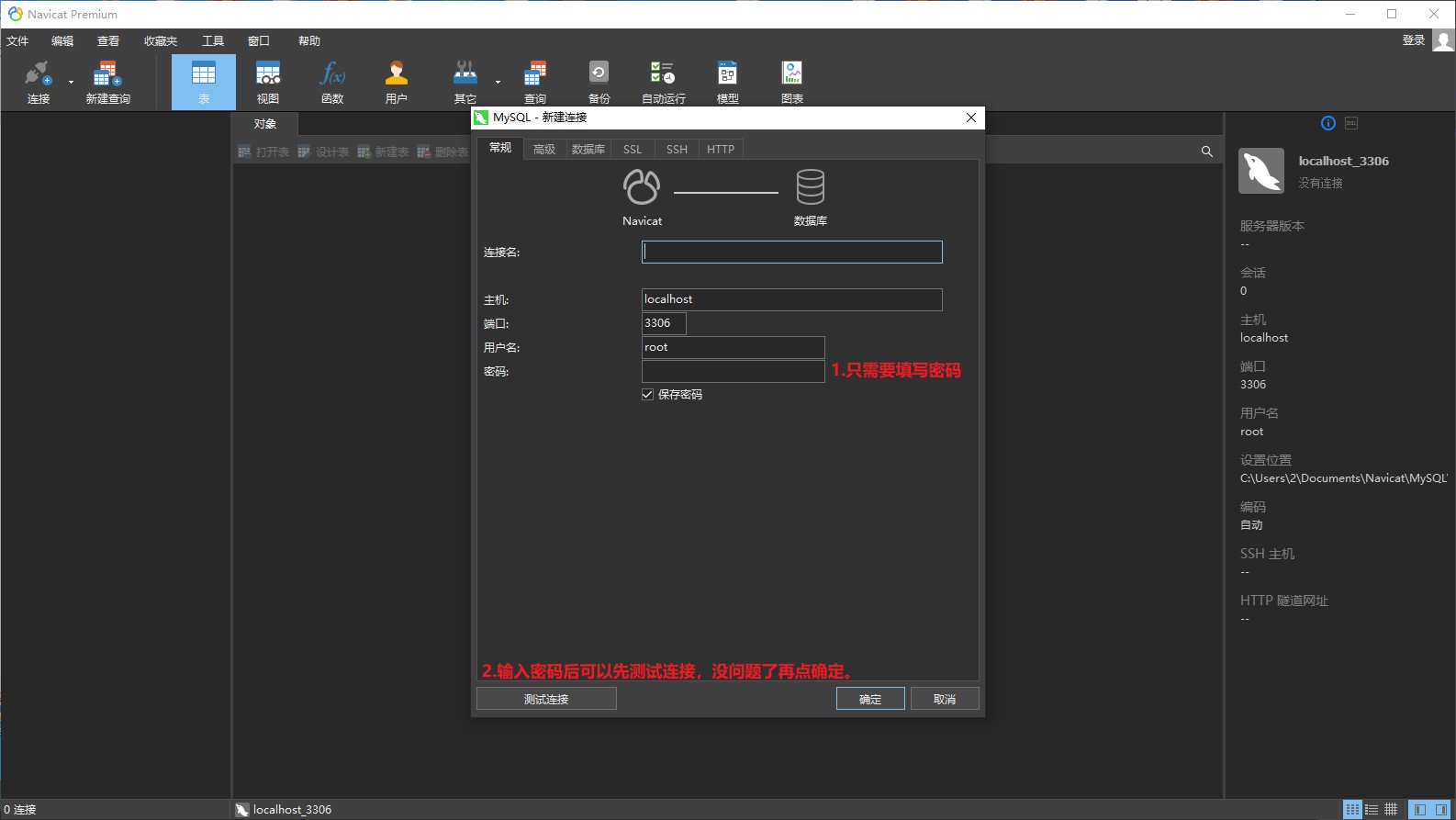 点击MySQL,会弹出新建连接对话框。对话框里的连接名、主机和端口还有用户名不需要我们修改,我们只需要输入密码就可以了。输入密码后可以点左下角的连接测试,没问题了再点确定