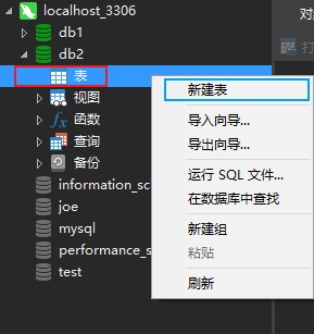 双击打开新建的数据库,在表选项旁边右键选择新建表。