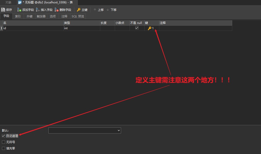 新建表后,就可以定义字段,名字、类型、长度、小数点都不用考虑。需要注意的是键列,当光标移动到这一栏的时候,按下空格就可以将这个字段定义为主键,定义逐渐之后也别忘了开启右下角的自动递增选项。