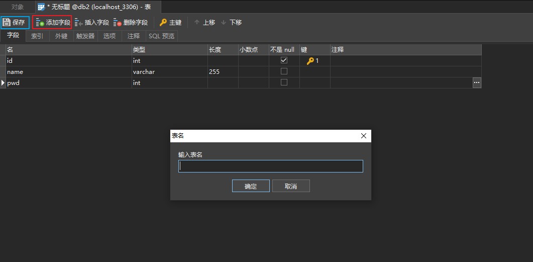 定义好字段之后,点击保存,会弹出输入表名的对话框,点击确定即可。