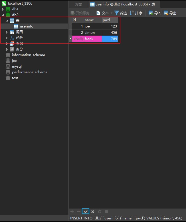 id已经点了主键自增所以不必输入,只需要填写name和pwd两列就行了。