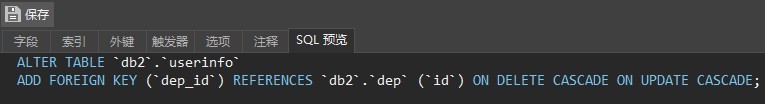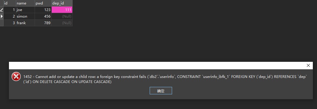 设定好外键后,表userinfo里的dep_id列就不能随便瞎写了,必须得写表dep里的id了。