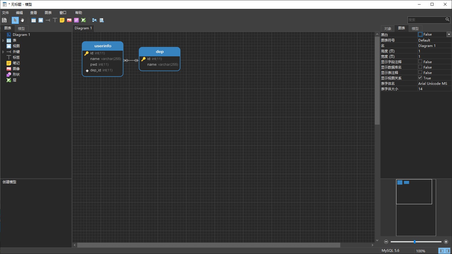 然后就会显示一张图标,可以很清晰地显示出库下的表们互相之间是否有联系。