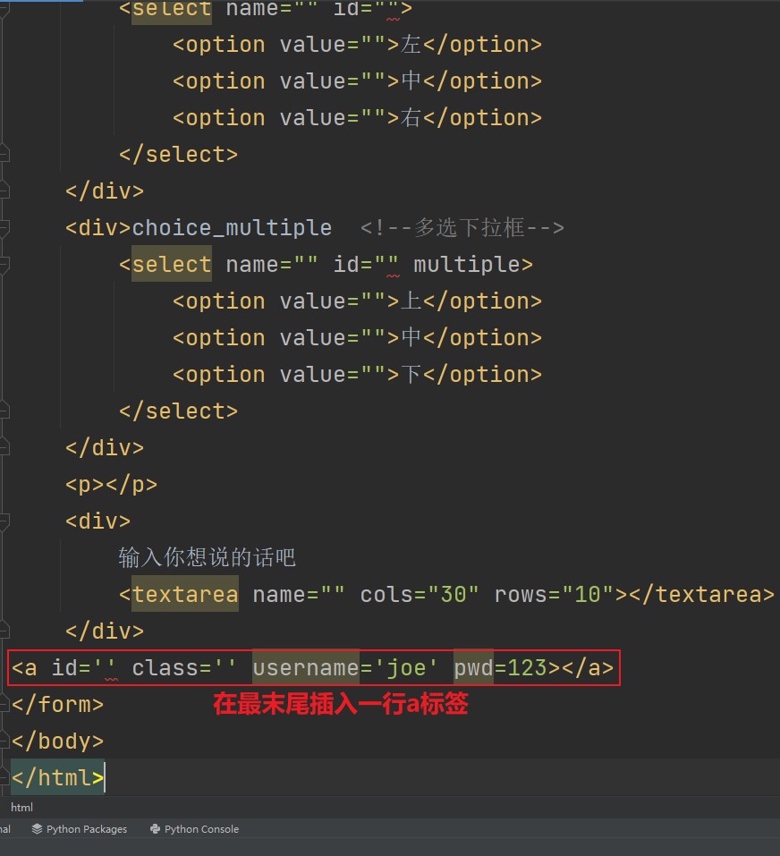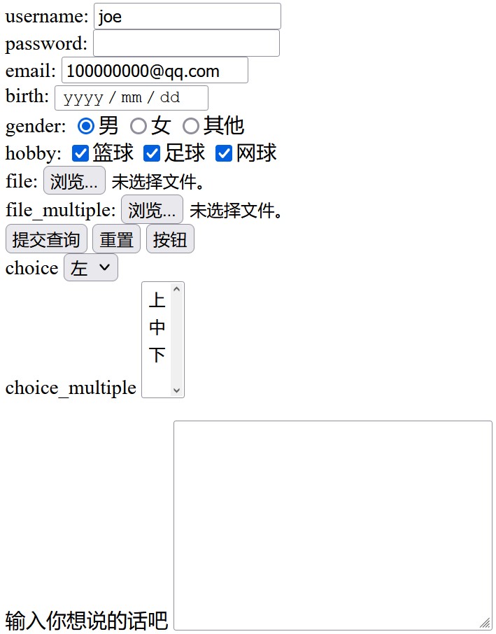 <form action=""> <div>username: <!--添加描述:获取用户名--> <input type="text"> <!--设置一个输入框,输入数据的类型是文本类型--> </div> <div>password: <!--添加描述:获取密码--> <input type="password"> <!--设置一个输入框,输入的数据类型是加密的--> </div> <div>email: <!--添加描述:获取邮箱--> <input type="email"> <!--设置一个输入框,输入的数据类型是email地址--> </div> <div>birth: <!--添加描述:获取生日--> <input type="date"> <!--设置一个输入框,可以通过万年历选择日期--> </div> <div>gender: <!--添加描述:获取性别--> <input type="radio" name="gender">男 <!--设置一个选项,“男”,性别最多只能选一个--> <input type="radio" name="gender">女 <!--设置一个选项,“女”,性别最多只能选一个--> <input type="radio" name="gender">其他 <!--设置一个选项,“其他”,性别最多只能选一个--> </div> <div>hobby: <!--添加描述:获取爱好--> <input type="checkbox">篮球 <!--设置一个选项,“篮球”,可多选--> <input type="checkbox">足球 <!--设置一个选项,“足球”,可多选--> <input type="checkbox">网球 <!--设置一个选项,“网球”,可多选--> </div> <div>file: <input type="file"> <!--上传单个文件--> </div> <div>file_multiple: <input type="file" multiple> <!--上传多个文件--> </div> <div> <input type="submit"> <input type="reset"> <input type="button" value="按钮"> </div> <div>choice <!--单选下拉框--> <select name="" id=""> <option value="">左</option> <option value="">中</option> <option value="">右</option> </select> </div> <div>choice_multiple <!--多选下拉框--> <select name="" id="" multiple> <option value="">上</option> <option value="">中</option> <option value="">下</option> </select> </div> <p></p> <div> 输入你想说的话吧 <textarea name="" cols="30" rows="10"></textarea> </div> </form>