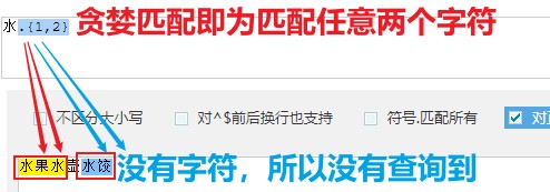 待匹配的文本:水果水壶水饺 正则 结果 分析 水. 水果/水壶/水饺 .可以匹配换行符之外的任意字符.所以水.查询到水果、水壶、水饺。 ^水. 水果 ^限定了只能获取字符串的开头;.可以匹配任意字符。连起来就是查询字符串最开头水字和后面的任意字(果)水+果=水果。 水.$ 水饺 .可以匹配任意字符;$限定了只能获取字符串的结尾。连起来就是水字和字符串末尾是任意字(饺)水+饺=水饺。 水.* 水果水壶水饺 .可以匹配任意字符;*代表字符匹配可重复零次或多次,在贪婪匹配下会尽可能多的选取匹配到的字符并且一口气呈现出来。 水.? 水果/水壶/水饺 .可以匹配任意字符;?代表字符匹配可重复零次或一次,而重复一次就代表重复整个正则表达式本身,所以水.?就等同于水.。所以水.?查询到水果、水壶、水饺。 水.+ 水果水壶水饺 .可以匹配任意字符;+代表字符匹配可重复一次或多次,所以.+配合就意味着可以向后查询无限多个任意字符。水+果水壶水饺 水.{1,2} 水果水/水饺 .可以匹配任意字符;{1,2}代表字符匹配可重复1到2次,贪婪匹配默认为两次,也就是可以匹配2个字符(水XX)。水+果水、水饺