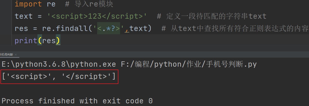import re # 导入re模块 text = '<script>123</script>' # 定义一段待匹配的字符串text res = re.findall('<.*?>',text) # 从text中查找所有符合正则表达式的内容 print(res)