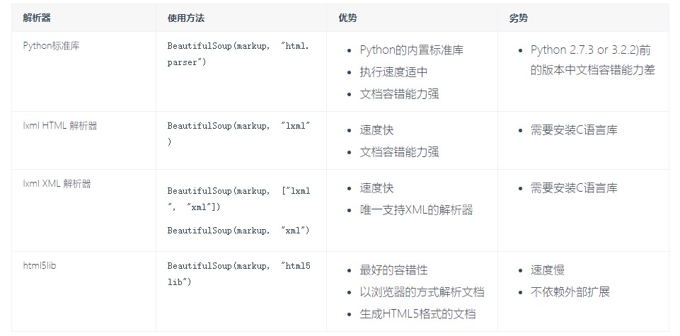 解析器可以简单理解为启动bs4的钥匙。在Python2.7.3之前的版本和Python3中3.2.2之前的版本,必须安装lxml或html5lib, 因为那些Python版本的标准库中内置的HTML解析方法不够稳定。