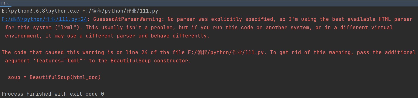 莫慌,虽然用的是红色字体,但这并不是报错。这段话就是在提醒你没有选定解析器,所以使用了默认的解析器。只要我们把解析器加上,就正常运作了。