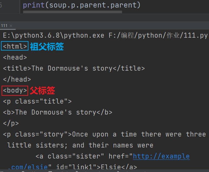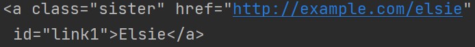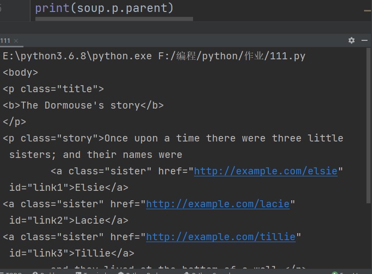 </--!构造一个html文件--> html_doc = <html> <head> <title>The Dormouse's story</title> </head> <body> <p class="title"> <b>The Dormouse's story</b> </p> <p class="story">Once upon a time there were three little sisters; and their names were <a href="http://example.com/elsie" class="sister" id="link1">Elsie</a> <a href="http://example.com/lacie" class="sister" id="link2">Lacie</a> <a href="http://example.com/tillie" class="sister" id="link3">Tillie</a> and they lived at the bottom of a well.</p> <p class="story">...</p> </body> </html>