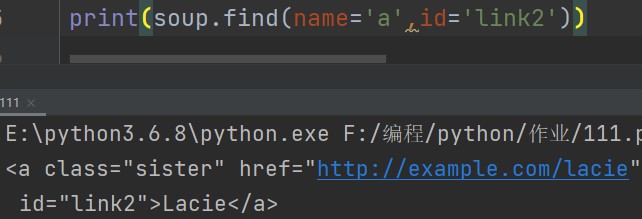 soup.find(name='a',id='link2') # 查找具有某个特定属性的标签,默认只找符合条件的第一个