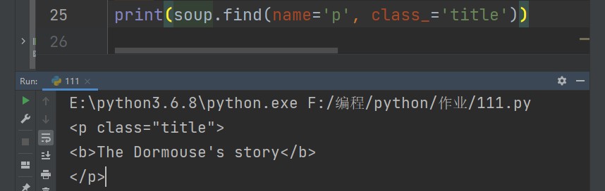 soup.find(name='p',class_='title' # 为了解决关键字冲突,会加下划线区分