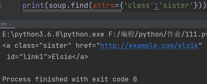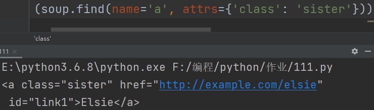 soup.find(attrs={'class':'sister'}) # name字段不写则表示查找所有符合后续条件的标签