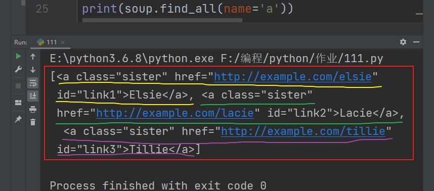 soup.find_all(name='a') soup.find_all('a') # name字段可以省略,查找结果是一个列表