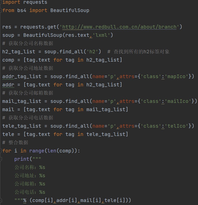 for i in range(len(title_list)): print(""" 公司名称:%s 公司地址:%s 公司邮箱:%s 公司电话:%s """% (comm[i],addr[i],mail[i],tele[i]))