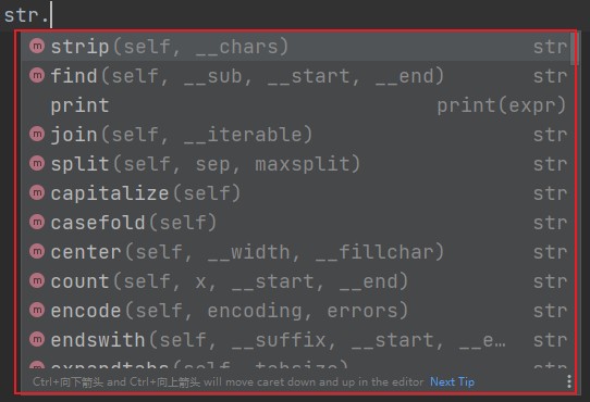 使用pycharm的一大好处就在于,加了句点符之后它会自动列出该数据所有的方法。甚至后面会讲到python的更多功能,那时候句点符也会频频登场。