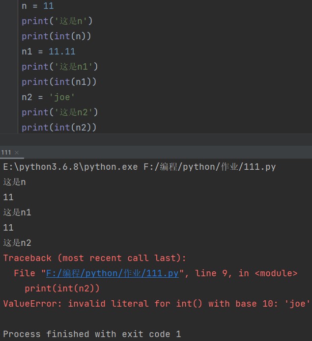int(整型) eg: n = 11 print(int(n)) # 11 n1 = 11.11 print(int(n1)) # 11 n2 = 'joe' print(int(n2)) # 报错