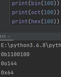 bin(十进制数) # 十进制转二进制 oct(十进制数) # 十进制转八进制 hex(十进制数) # 十进制转十六进制 eg: print(bin(100)) # 0b1100100 print(oct(100)) # 0o144 print(hex(100)) # 0x64