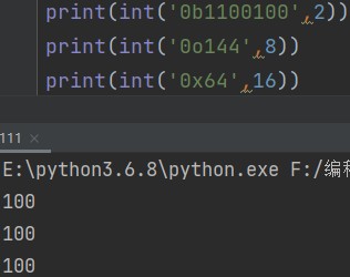 int('0b数字',2) # 二进制转十进制 int('0o数字',8) # 八进制转十进制 int('0x数字',16) # 十六进制转十进制 eg: print(int('0b1100100', 2)) # 100 print(int('0o144', 8)) # 100 print(int('0x64', 16)) # 100