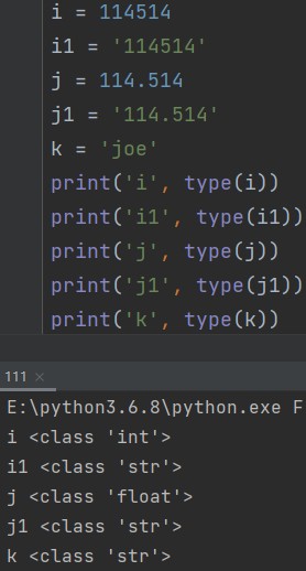 i = 114514 i1 = '114514' j = 114.514 j1 = '114.514' k = 'joe' print(type(i)) # 整型 print(type(i1)) # 字符串 print(type(j)) # 浮点型 print(type(j1)) # 字符串 print(type(k)) # 字符串