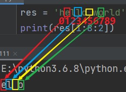 res[起始位:终止位:间隔位数] eg: print(res[1:8:2]) # el o