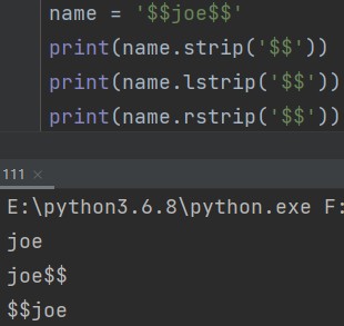 字符串.strip('要移除的字符') eg: name = '$$joe$$' print(name.strip('$')) # joe print(name.lstrip('$')) # joe$$ print(name.rstrip('$')) # $$joe