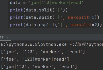 字符串.split('以什么字符为切割点') eg: data = 'joe|123|worker|read' print(data.split('|')) # ['joe', '123', 'worker', 'read'] # 分组切割(组数不够则保留原来的样式) 字符串.split('以什么字符为切割点', maxsplit=单独切出来的组数) eg: print(data.split('|', maxsplit=1)) # ['joe', '123|worker|read'] # 从右边开始分组切割 字符串.rsplit('以什么字符为切割点', maxsplit=单独切出来的组数) eg: print(data.rsplit('|', maxsplit=1)) # ['joe|123|worker', 'read']