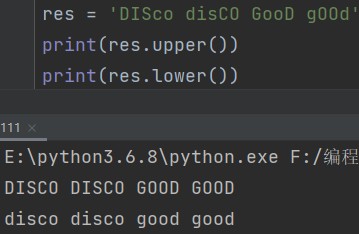 字符串.upper() # 全部转大写 字符串.lower() # 全部转小写 eg: res = 'DISco disCO GooD gOOd' print(res.upper()) # DISCO DISCO GOOD GOOD print(res.lower()) # disco disco good good