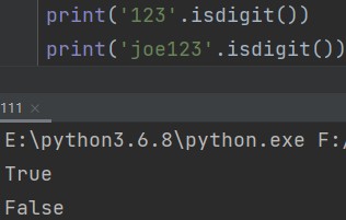 '字符串'.isdigit() eg: print('123'.isdigit()) # True print('joe123'.isdigit()) # False