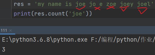 字符串.count('需要统计的字符') eg: res = 'my name is joe joe zoe joey joel' print(res.count('joe')) # 3