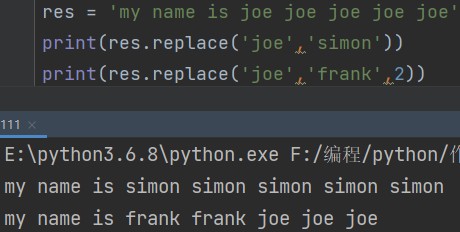 字符串.replace('需要替换的字符','替换后的字符','替换次数,不写默认全部替换') eg: res = 'my name is joe joe joe joe joe' print(res.replace('joe', 'simon')) # my name is simon simon simon simon simon print(res.replace('joe', 'frank', 2)) # my name is frank frank joe joe joe