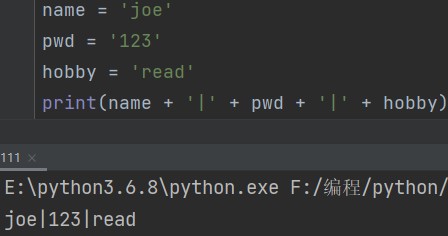 字符串1 + '拼接字符' + 字符串2 eg: name = 'joe' pwd = '123' hobby = 'read' print(name + '|' + pwd + '|' + hobby) # joe|123|read