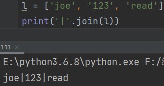 '拼接字符'.join(列表) eg: l = ['joe', '123', 'read'] print('|'.join(l)) # joe|123|read