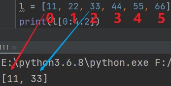列表[起始位:终止位] eg: print(l[0:4]) # 11, 22, 33, 44