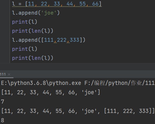列表.append(添加的元素) eg: l.append('joe') # 追加字符串 print(l) # [11, 22, 33, 44, 55, 66, 'joe'] print(len(l))7 l.append([111, 222, 333]) # 追加列表 print(l) # [11, 22, 33, 44, 55, 66, 'joe', [111, 222, 333]] print(len(l)) # 8