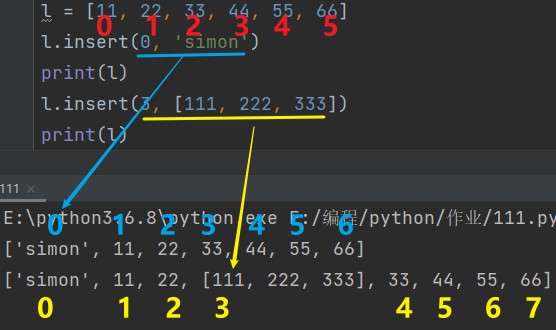 列表.insert(序号,插入的元素) eg: l.insert(0, 'simon') print(l) # ['simon', 11, 22, 33, 44, 55, 66] l1.insert(2, [111, 222,333]) print(l) # ['simon', 11, 22, [111, 222,333], 33, 44, 55, 66]
