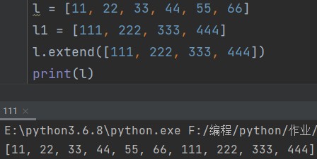 列表.extend(插入的列表) eg: l1 = [111, 222, 333, 444] l.extend(l1) print(l) # [11, 22, 33, 44, 55, 66, 111, 222, 333, 444]