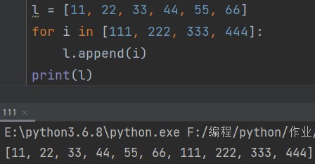 for i in [111,222,333,444]: l.append(i) print(l) # [11, 22, 33, 44, 55, 66, 111, 222, 333, 444]